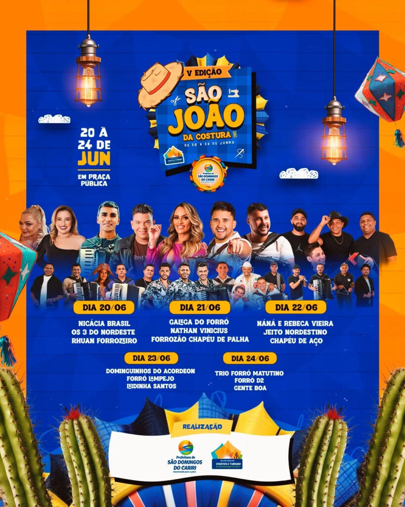 A Prefeitura de São Domingos do Cariri anunciou oficialmente as atrações da 5ª edição do São João da Costura, tradicional festa junina do município, que promete movimentar a cidade entre os dias 20 e 24 de junho, com apresentações em praça pública. O evento reunirá grandes nomes do forró e artistas locais em cinco dias […]