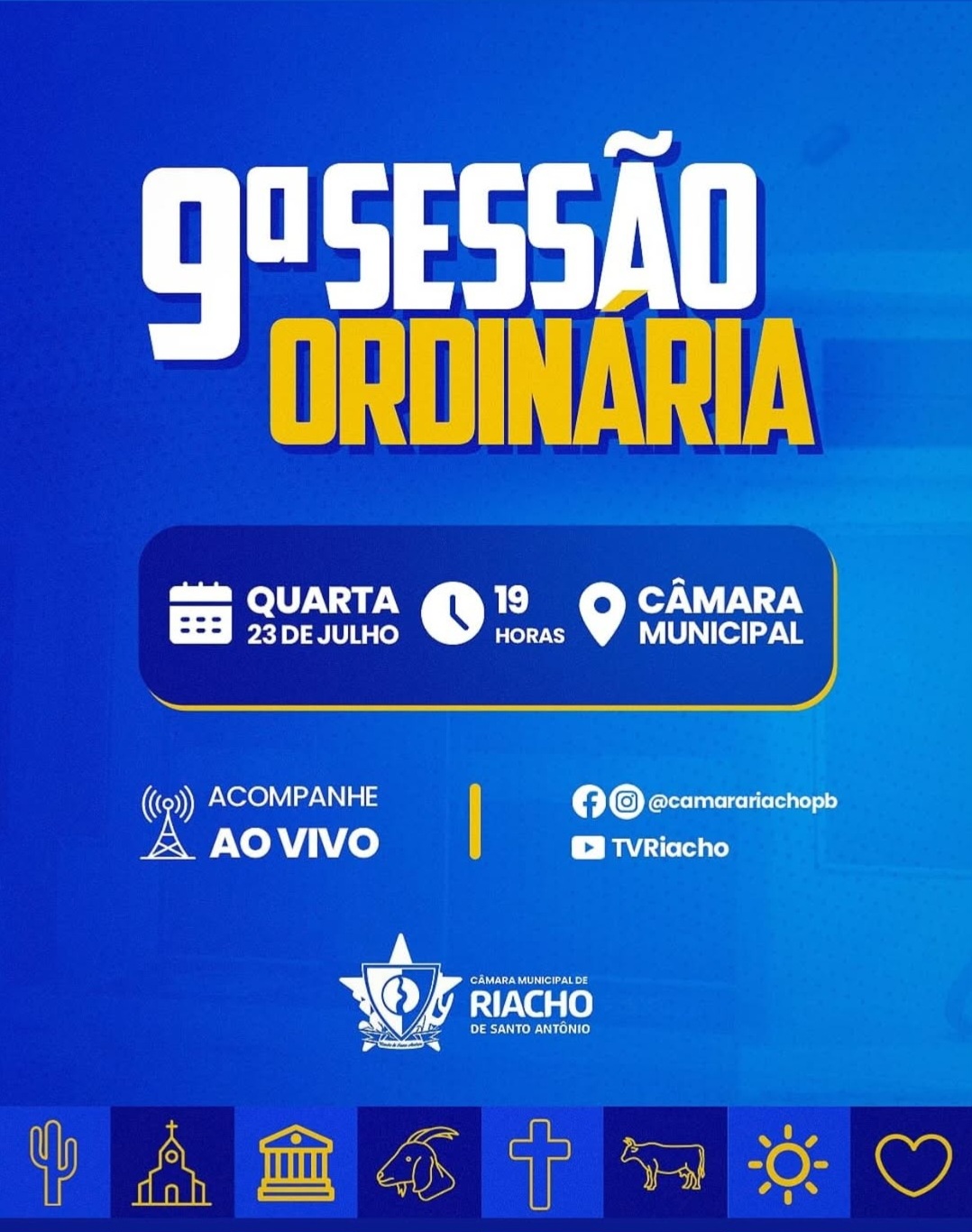 A Câmara Municipal de Riacho de Santo Antônio realizará, na próxima quarta-feira, dia 23 de julho, a 9ª Sessão Ordinária do ano de 2025. A reunião acontecerá sob a presidência do Vereador Ciel Oliveira, que convida todos os parlamentares, bem como a população em geral, para se fazerem presentes e acompanharem os trabalhos legislativos. A […]