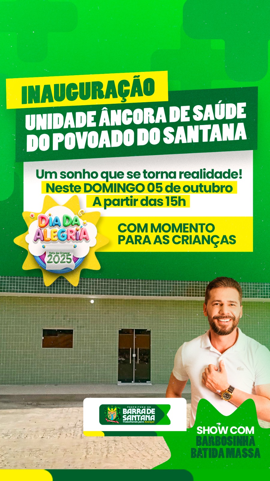 A Prefeitura de Barra de Santana realiza, no próximo domingo (05), a inauguração da Unidade Âncora de Saúde do Povoado do Santana, um marco importante para a comunidade. O evento terá início às 15h e contará com programação especial para as crianças, dentro das atividades do Dia da Alegria 2025. Além da entrega oficial do […]