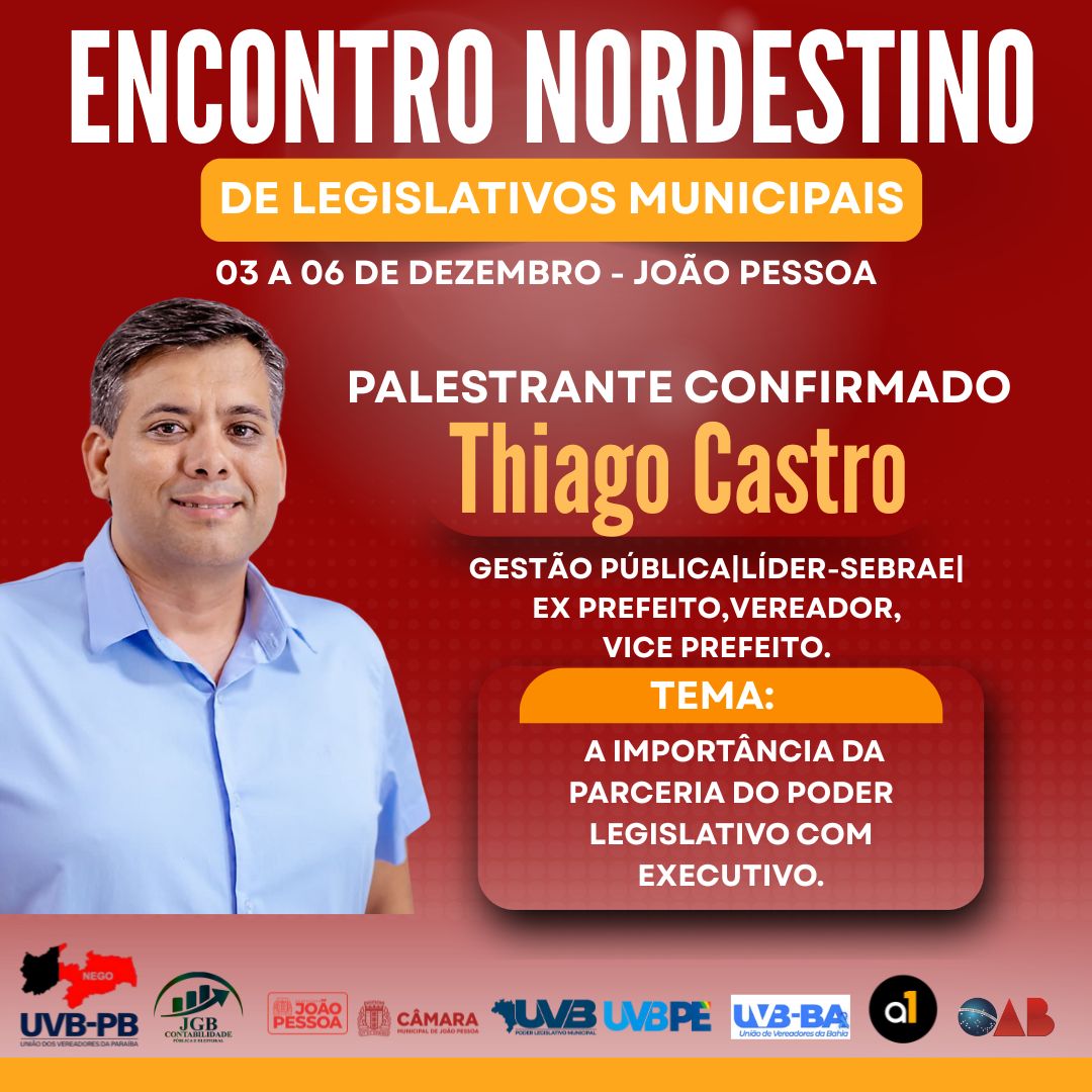 O Encontro Nordestino de Legislativos Municipais, que acontece entre os dias 03 e 06 de dezembro, em João Pessoa, terá como um dos palestrantes confirmados o especialista em gestão pública Tiago Castro. Reconhecido por sua sólida trajetória no setor público, Tiago Castro é ex-prefeito de Cabaceiras, no Cariri paraibano, além de já ter desempenhado os […]