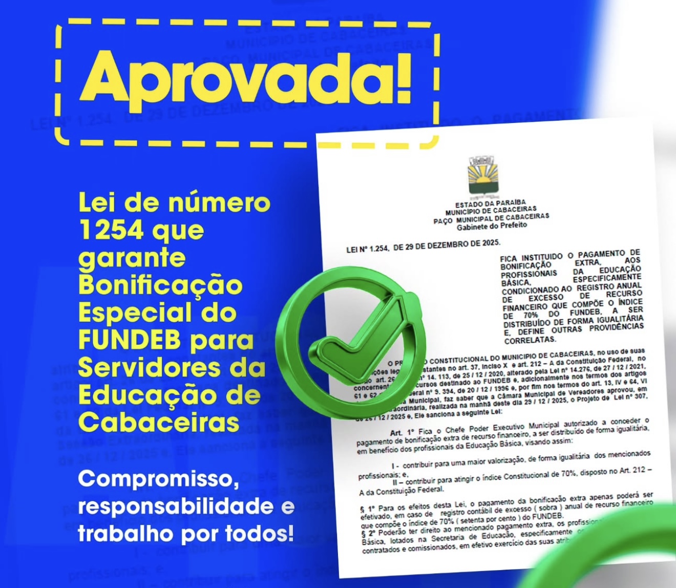 Prefeitura de Cabaceiras aprova Lei que garante Bonificação Especial do FUNDEB aos servidores da Educação