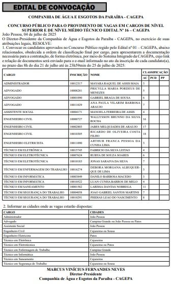 A Companhia de Água e Esgotos da Paraíba (cagepa) divulgou nova lista de convocação de aprovados no concurso público para envio dos documentos necessários para contratação. Relação dos convocados foi publicada no Diário Oficial do Estado (DOE) deste sábado (5).