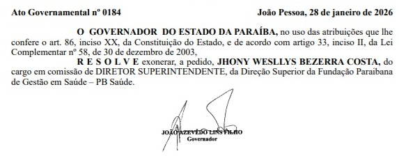 O Diário Oficial do Estado (DOE) publicou, na edição desta quinta-feira (29), a exoneração de Dr. Jhony Bezerra do cargo de diretor-superintendente da Fundação Paraibana de Gestão em Saúde (PB Saúde). A decisão foi assinada pelo governador João Azevêdo (PSB).