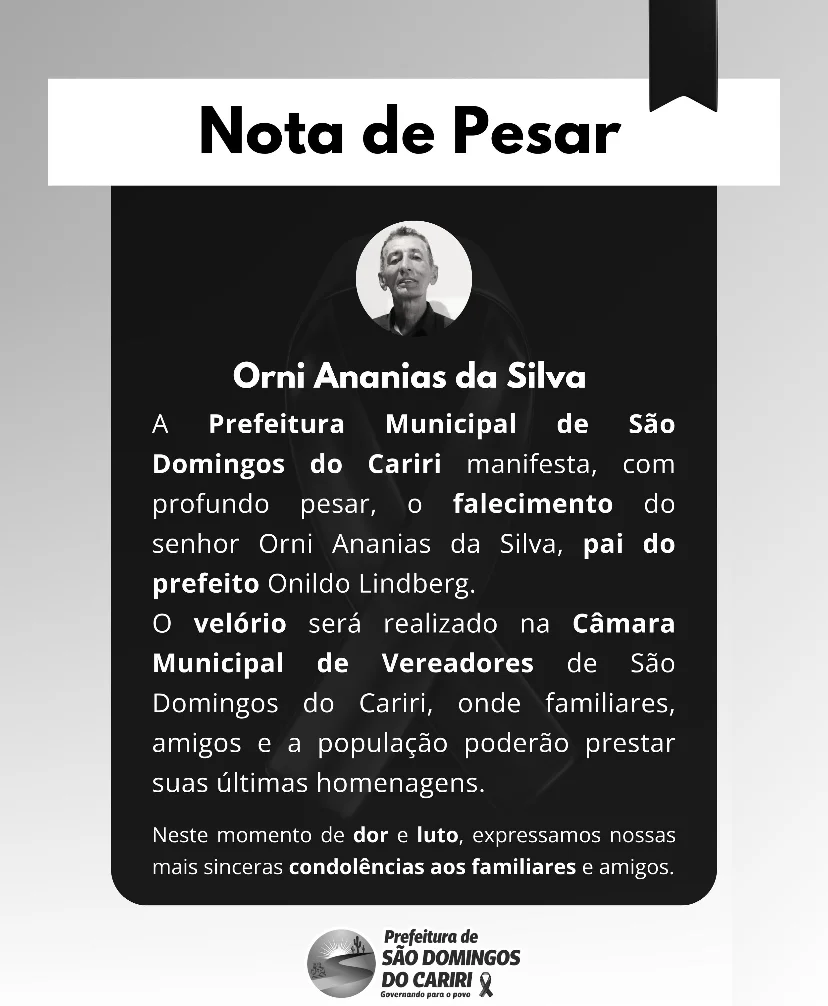 Neste momento de dor, a Prefeitura e toda a população de São Domingos do Cariri se solidarizam com o prefeito Onildo Lindberg e seus familiares, desejando força e consolo diante dessa irreparável perda.