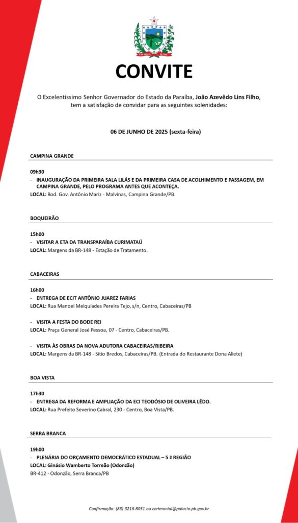 O governador da Paraíba, João Azevêdo, estará nesta sexta-feira, 06 de junho, na região do Cariri paraibano cumprindo uma ampla agenda administrativa. A programação contempla inaugurações de obras, visitas técnicas e participação em eventos culturais e institucionais, reforçando o compromisso do Governo do Estado com o desenvolvimento regional e a valorização da população do interior.