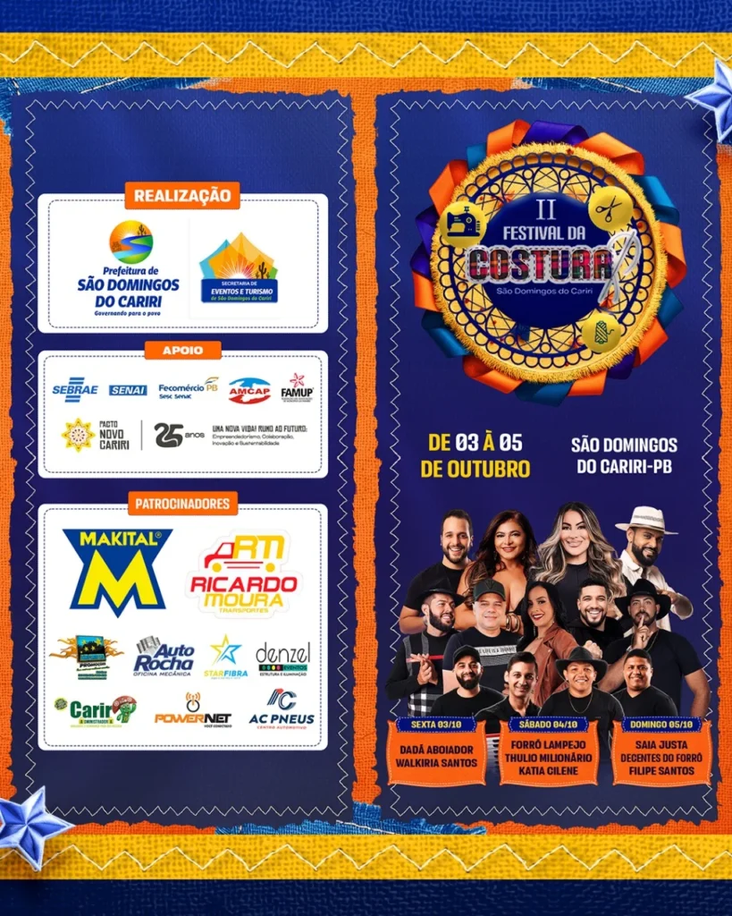 A Prefeitura de São Domingos do Cariri, por meio da Secretaria de Eventos e Turismo, divulgou a programação oficial do II Festival da Costura, que será realizado entre os dias 03 e 05 de outubro, no município. O evento deve movimentar a cidade com desfiles, exposições, apresentações culturais, turismo, gastronomia e grandes shows musicais.