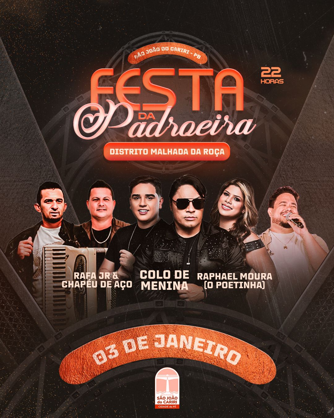 A Prefeitura Municipal de São João do Cariri tem o prazer de anunciar a realização da tradicional Festa da Padroeira Nossa Senhora das Graças, no Distrito Malhada da Roça, no próximo dia 03 de janeiro de 2026, a partir das 22h.