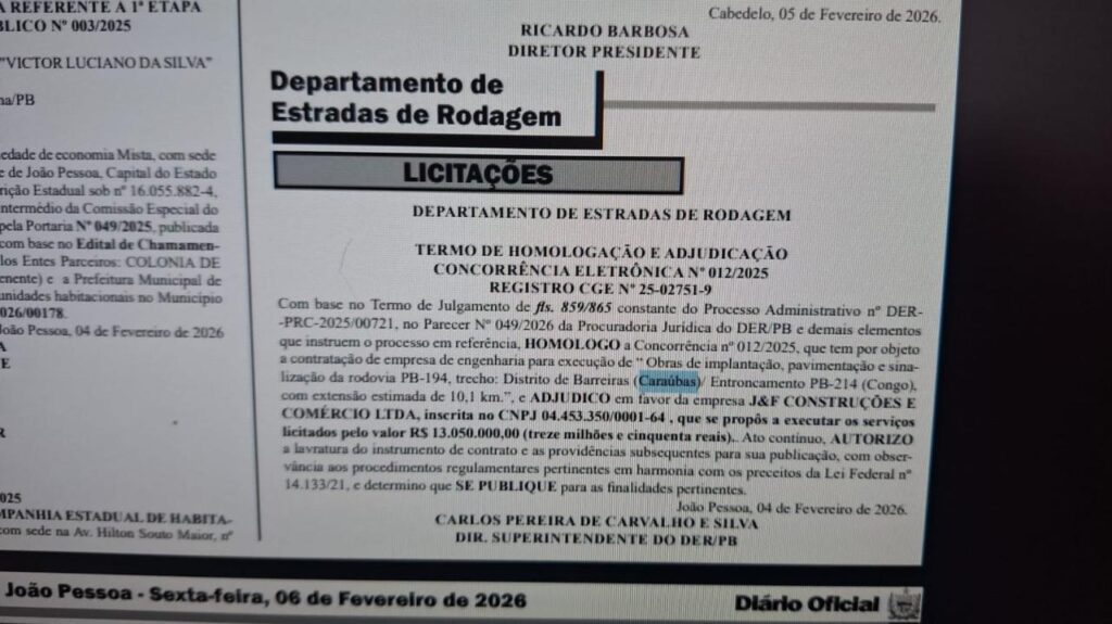O vice-prefeito de Caraúbas, Tomaz Bezerra, comemorou a homologação do processo licitatório para implantação, pavimentação e sinalização da rodovia que liga a PB-214 ao Distrito de Barreiras. A homologação foi oficializada pelo Departamento de Estradas de Rodagem da Paraíba (DER-PB) e marca o avanço definitivo da obra para a fase de execução.
